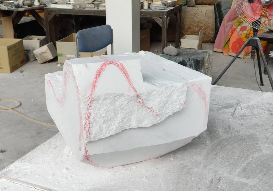 いよいよ大理石に彫刻 まず石にデッサン そしてかまぼこ状に彫る